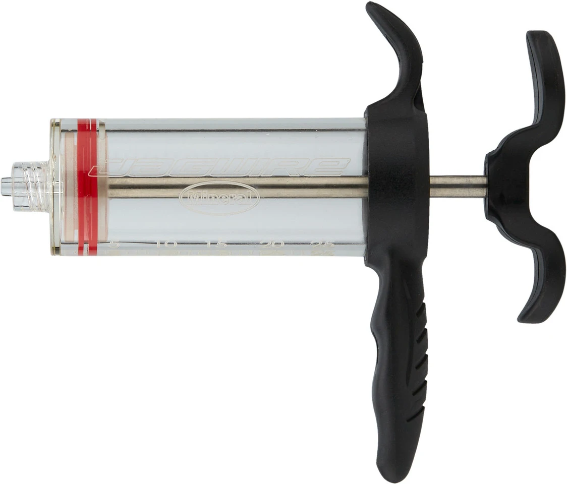 Ces seringues de purge sont des pièces de rechange originales pour le kit Jagwire Elite Bleed. Selon la version, elles sont compatibles avec les systèmes de frein à disque à base d’huile minérale, comme Shimano ou Magura, ou avec les systèmes de frein à disque à base de DOT, comme SRAM ou Hope. C’est reconnaissable à la couleur des joints : rouge pour l’huile minérale, noir pour le DOT.