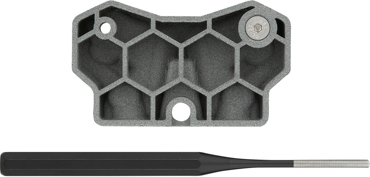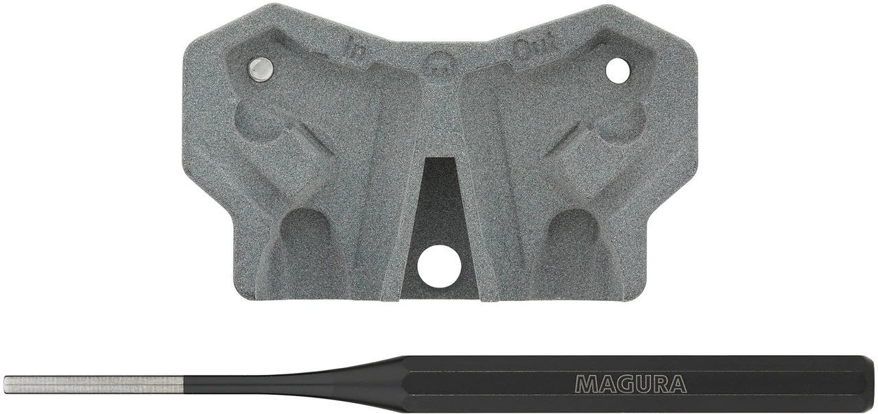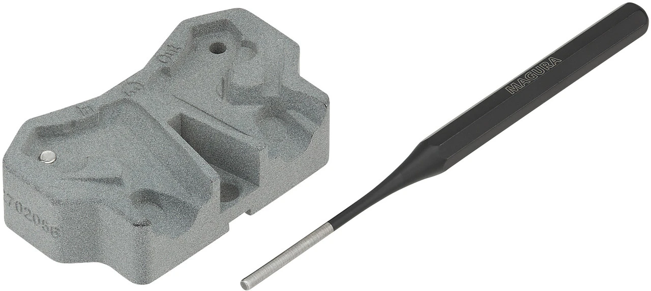 Cet outil de Magura est utilisé pour faciliter le remplacement du levier de frein à disque MT. Une partie de l’outil sert à fixer la poignée de frein, tandis que l’autre, l’outil d’insertion, te permet d’extraire ou d’enfoncer la goupille de roulement du levier de frein.
