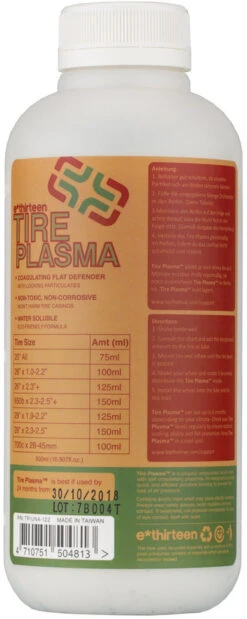 Le scellant pour pneus e*thirteen’s Tire Plasma a une composition unique avec des plaques autoréticulantes à base de résine acrylique. Il est conçu pour sceller rapidement et efficacement les fissures et les trous jusqu’à quatre millimètres de diamètre. La perte de pression dans tes pneus est maintenue aussi basse que possible et tu peux reprende la route directement. Grâce à la composition spéciale, ni les flancs de tes pneus ni l’environnement ne sont affectés. Dans certaines circonstances, les propriétés d’auto-réticulation du produit d’étanchéité peuvent provoquer une augmentation de la floculation du lait d’étanchéité. e*thirteen recommande donc de directement mettre le produit d’étanchéité dans le pneu. Le Tire Plasma est exempt d’ammoniaque.